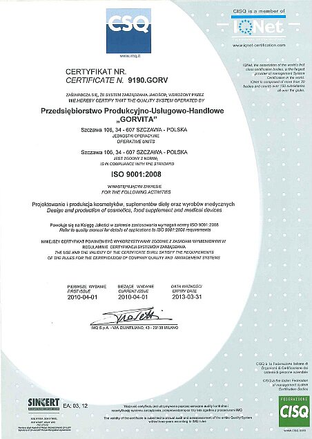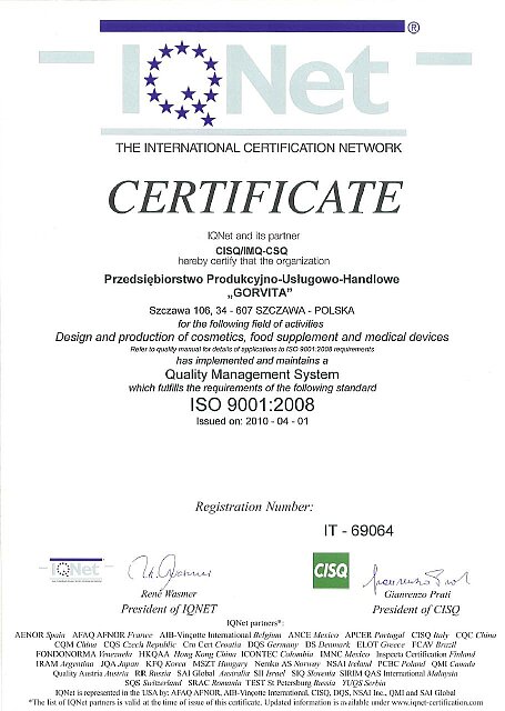 Z satysfakcją informujemy, że 1 kwietnia 2010 roku firma "GORVITA" uzyskała Certyfikat ISO 9001:2008. Uzyskany dokument potwierdził zgodność Systemu Zarządzania w zakresie projektowania i produkcji kosmetyków, suplementów diety oraz wyrobów medycznych.