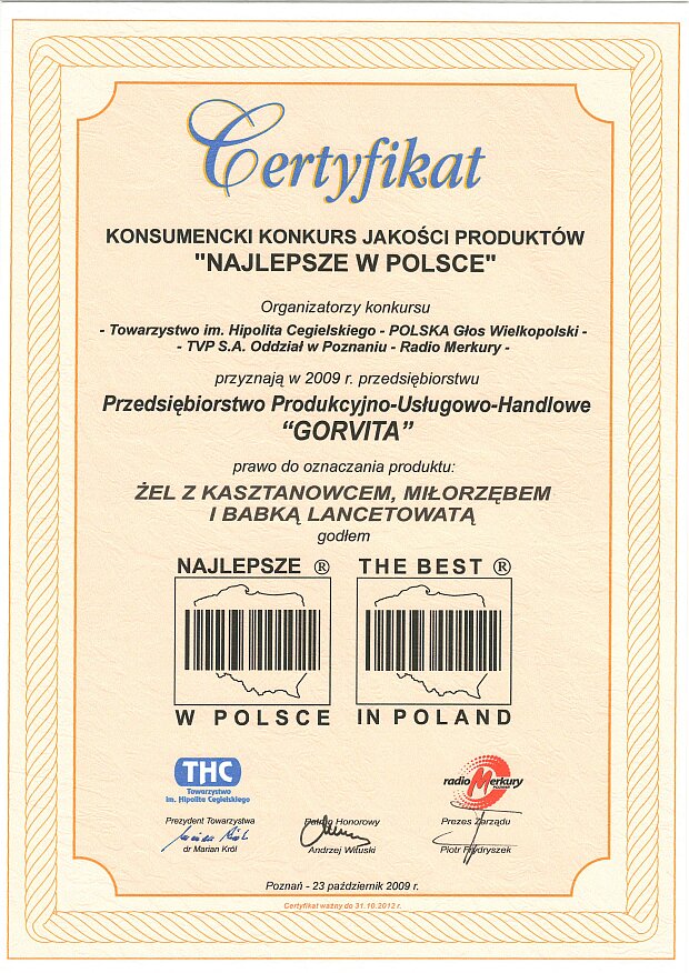 Dnia 23 października 2009r. w Poznaniu nasz produkt został uhonorowany godłem NAJLEPSZE W POLSCE.