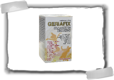 GERIAFIX to starannie dobrana kompozycja 27 składników: mieszanek i ekstraktów ziołowych wzbogaconych kolagenem, kwasem hialuronowym witaminami i minerałami. Składniki w naturalny sposób wspomagają organizm w okresach przemęczenia i osłabienia. Działają wzmacniająco i witalizująco poprawiając komfort życia fizycznego i psychicznego.